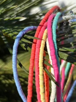 Elaboradas a mano una a una, nuestras piezas están fabricadas con cuentas Heishi de arcilla polimérica y cierres en acero inoxidable, garantizando resistencia, ligereza y un acabado impecable. La variedad de colores disponibles te permite elegir desde tonos vibrantes hasta neutros elegantes, adaptándose a tu personalidad y a cada ocasión.