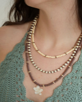 Cada pieza está fabricada artesanalmente con cuentas Heishi y dijes en acero inoxidable, ofreciendo durabilidad, estilo y un diseño único.